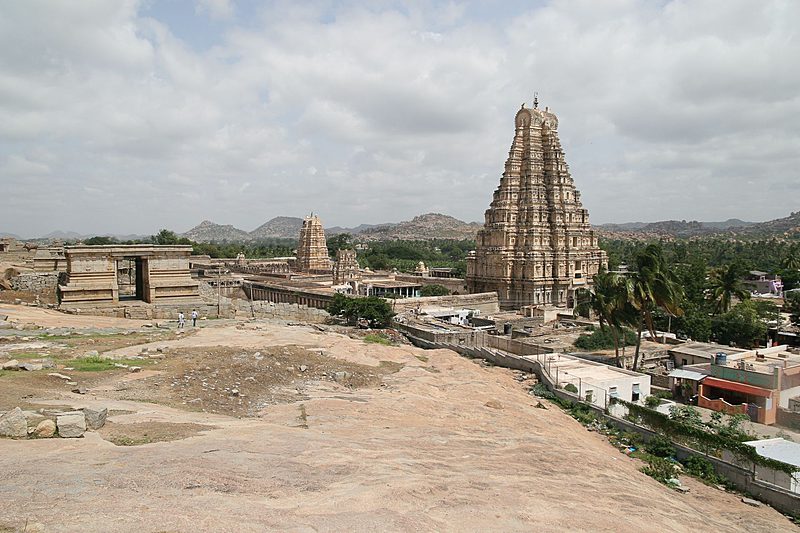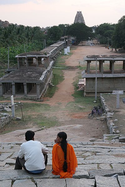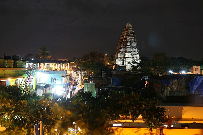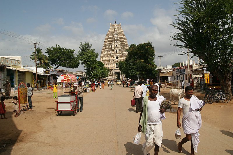 In Hampi Bazaar selbst ist der älteste und fast 50 m hohe Eingangsturm des Virupaksha Tempels allgegenwärtig.