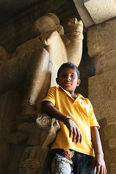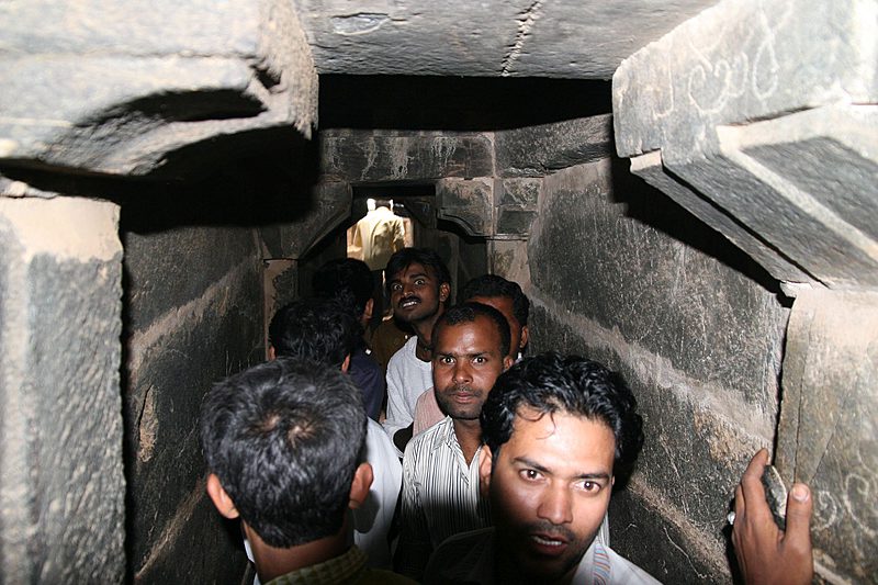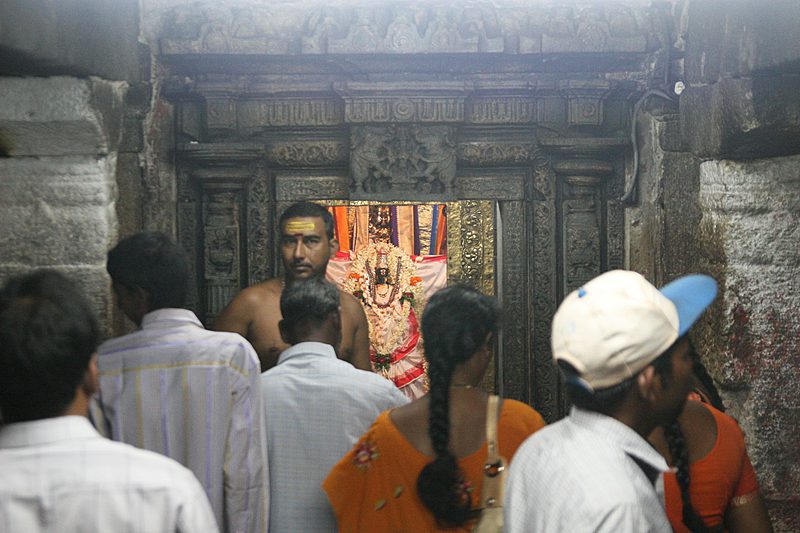 Im Inneren der Tempel befindet sich stets die Statue einer Gottheit, zu der die Gläubigen beten. Die Männer mit den nackten Oberkörpern sind die Priester der Tempel, die einem beispielsweise einen Bindi– oder Tilaka-Punkt auf die Stirn malen oder eine Opfergabe entgegennehmen.