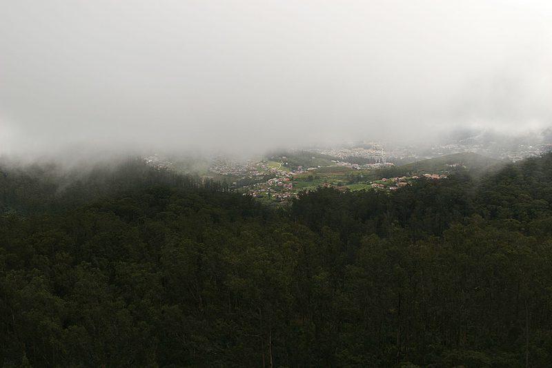 Am Nachmittag habe ich mir ein Taxi gemietet und mich ein bißchen durch die Gegend fahren lassen. Der Doddabetta-Aussichtspunkt etwa liegt – nach Auskunft meines Fahrers – auf dem höchsten Berg Südindiens auf 2.633 m Höhe und bietet eine gute Aussicht auf die umliegenden Städte. Eigentlich. Falls nicht alles im Nebel versinkt.