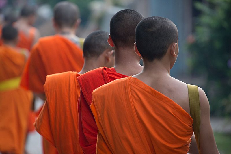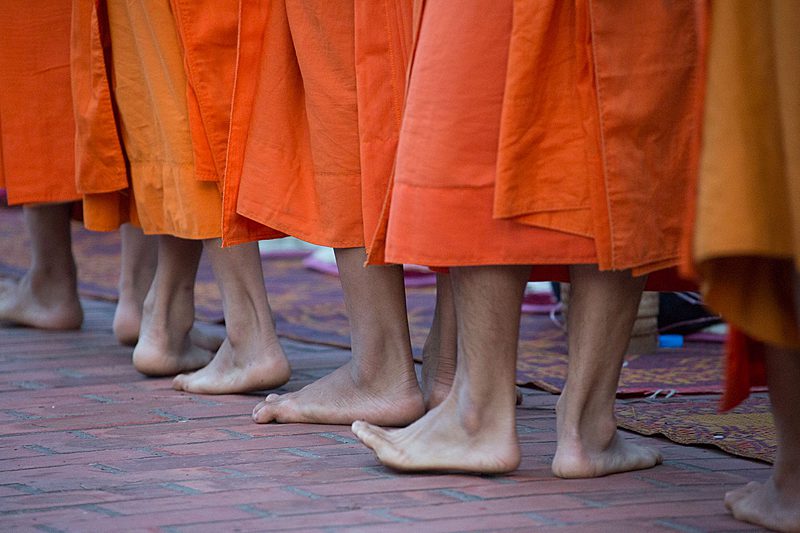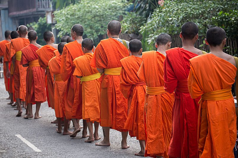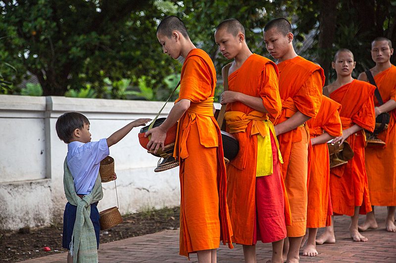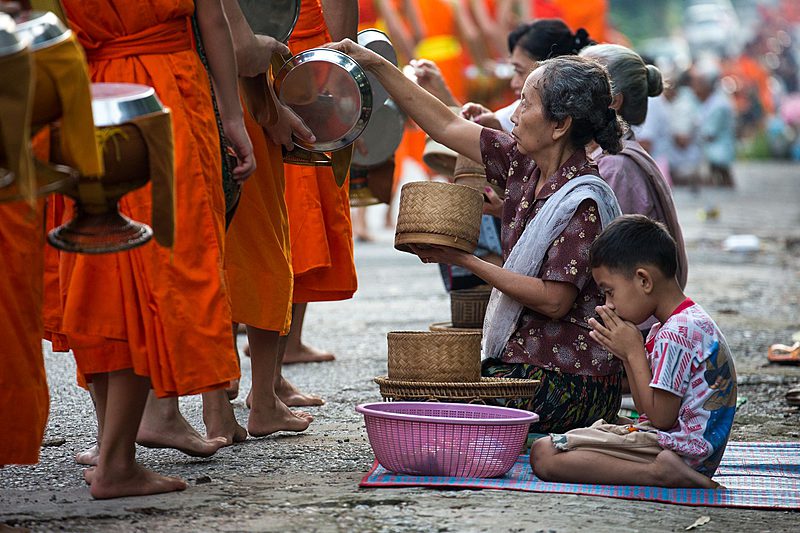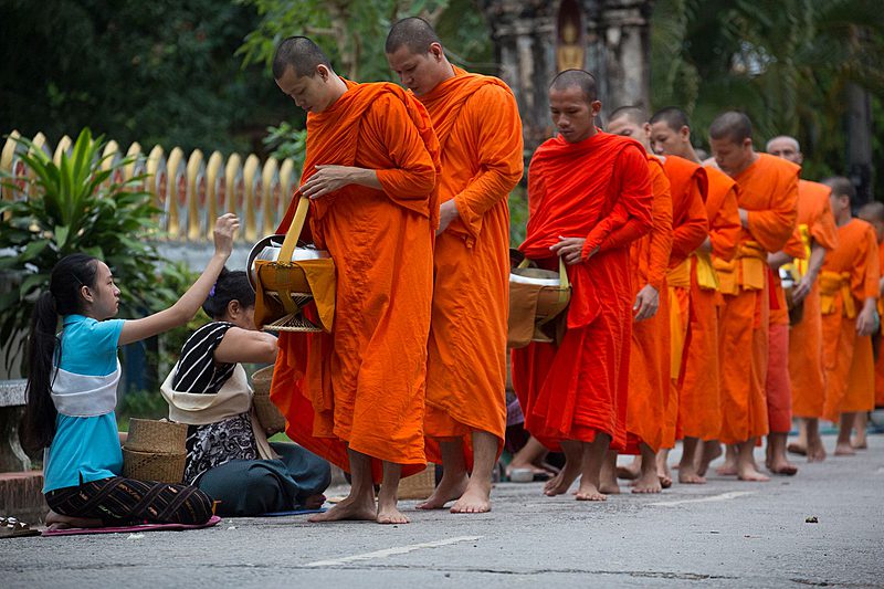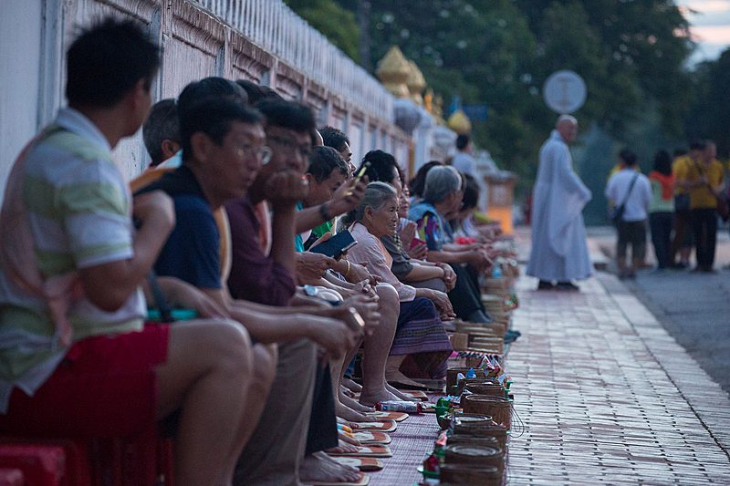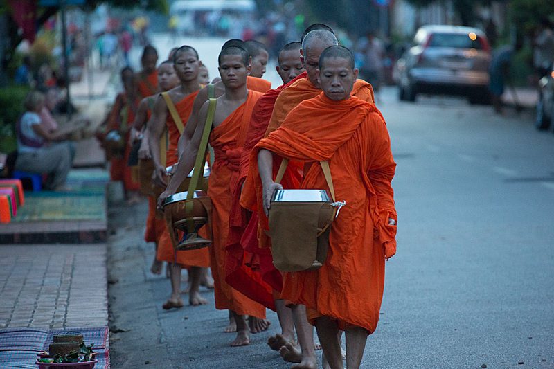 Das Highlight für die meisten Besucher sind aber nicht die Märkte, Tempel oder Museen der Stadt, sondern das sogenannte Tak Bat. Jeden Morgen verlassen hunderte Mönche bei Sonnenaufgang die Tempel und laufen barfuß, nur mit ihren orangefarbenen Roben bekleidet durch die Stadt. Dabei haben sie Almosenschalen umhängen und bitten die am Straßenrand wartenden Buddhisten um eine Handvoll Reis. Auch wenn man diese Prozessionen in ganz Laos beobachten kann, zieht Luang Prabang die meisten Besucher an. Die zunehmende Zahl von Zuschauern führt jedoch leider dazu, dass man an manchen Stellen mehr Touristen als Mönche zählt und man hin und wieder ein kleines Blitzlichtgewitter neben den Mönchen ausbrechen sieht – auch wenn man verständlicherweise gebeten wird den Blitz abzuschalten und ein wenig Abstand zu halten.
