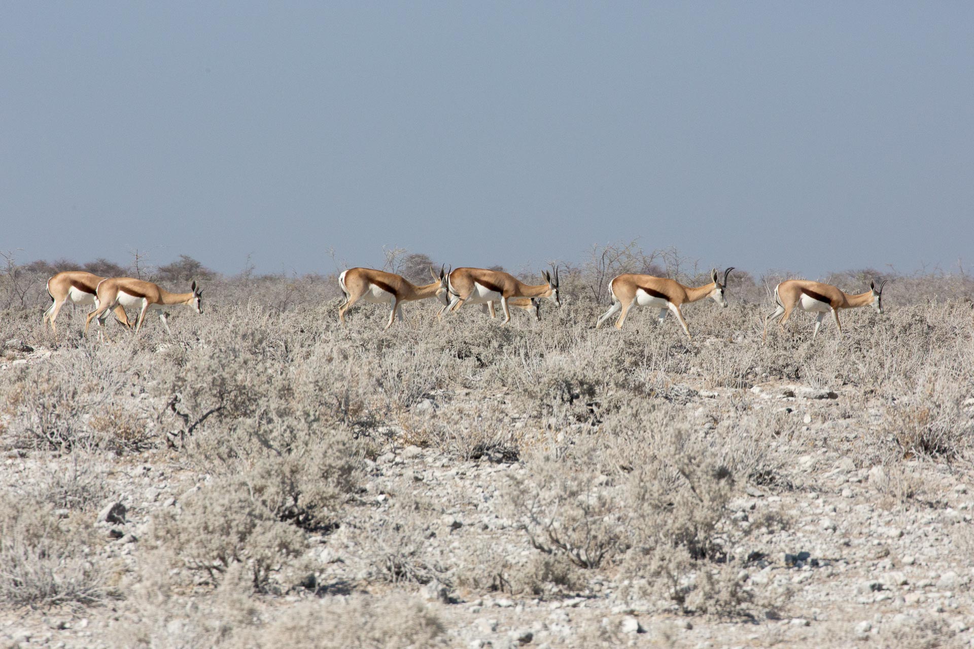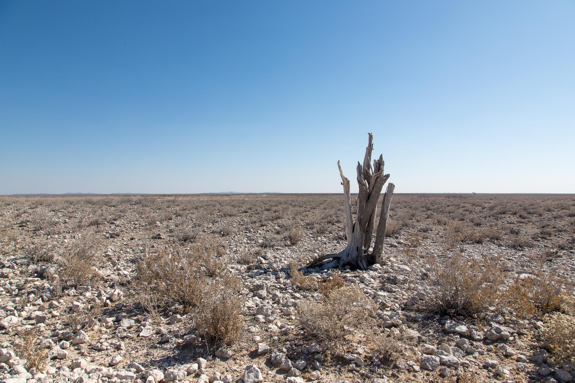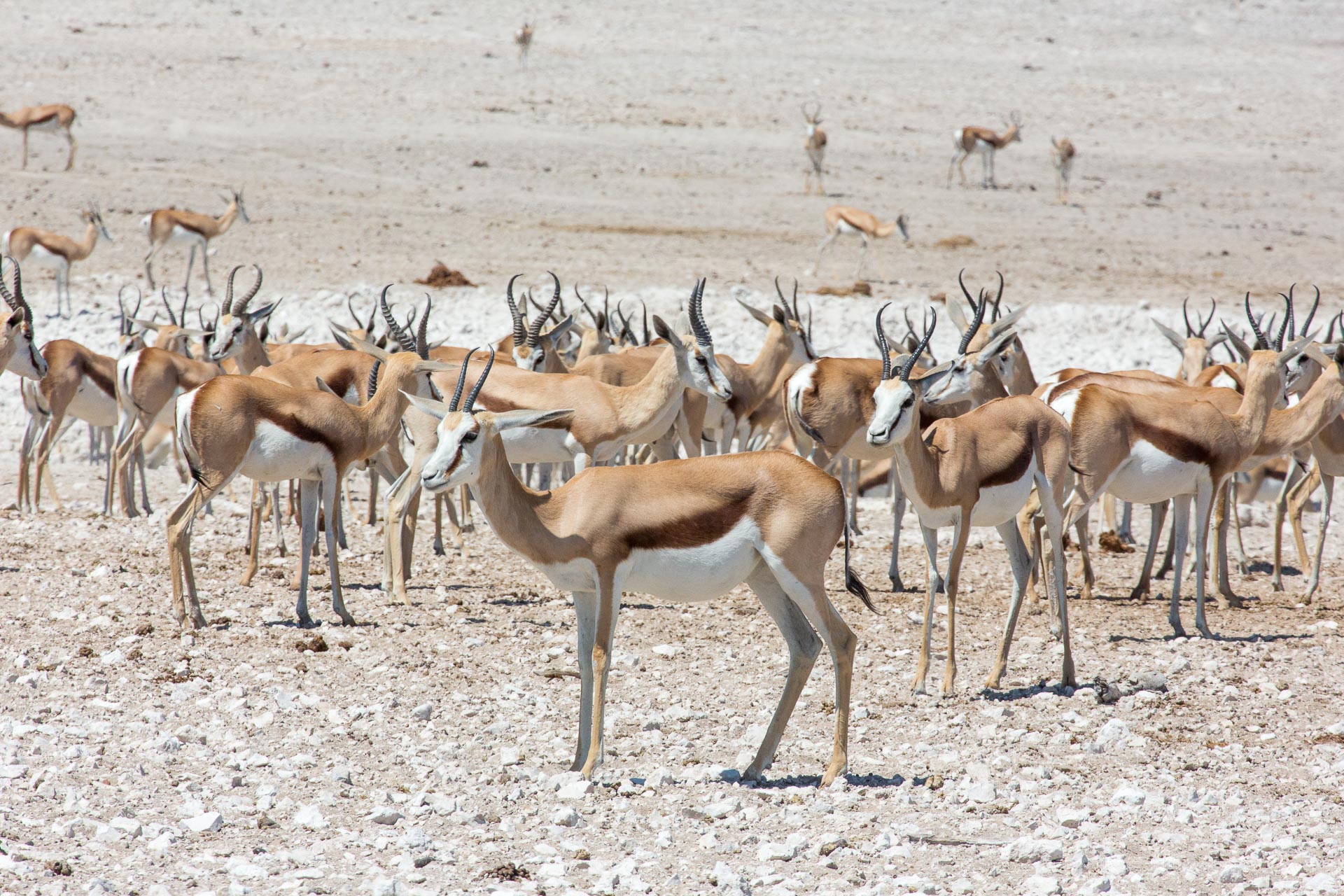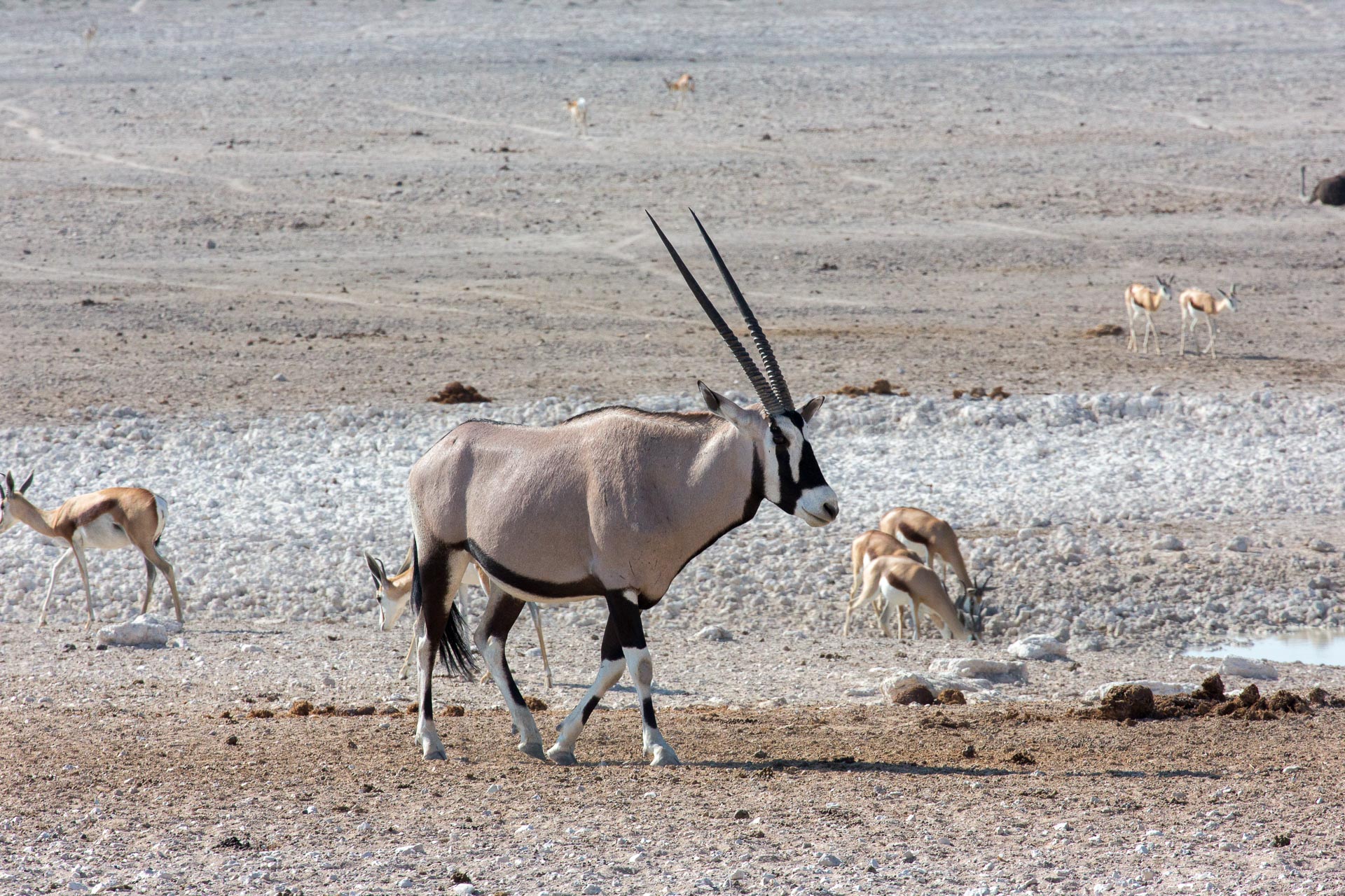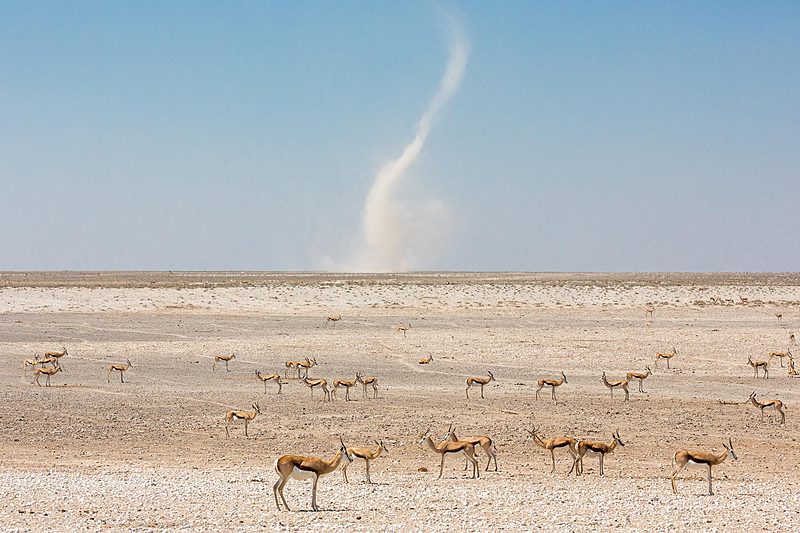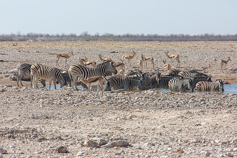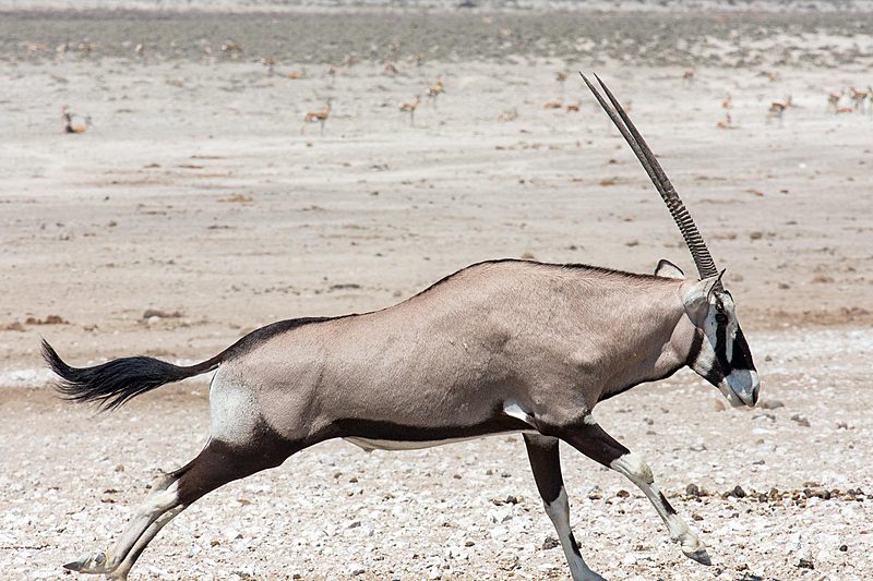 Mit über 22.000 km² Fläche (das entspricht etwa der Größe Hessens) ist der Etosha-Nationalpark das bedeutendste Schutzgebiet Namibias und einer der größten Nationalparks in ganz Afrika. Er schläg damit sogar den Krüger-Nationalpark in Südafrika um rund 2.000 km² – obwohl der Vergleich vielleicht nicht ganz fair ist, dann ein Teil des Etosha-Parks besteht aus der knapp 5.000 km² großen und im Allgemeinen recht lebensfeindlichen Etosha-Pfanne. Nur in besonders reichen Regenjahren läuft die Lehmpfanne bis zu 10 cm tief mit Wasser voll und lockt dann tausende Wasservögel an. In der restlichen Zeit versteht man, wie die Pfanne zu ihren Namen gekommen ist, denn Etosha bedeutet in der Ovambo-Sprache so viel wie „großer weißer Platz“.
