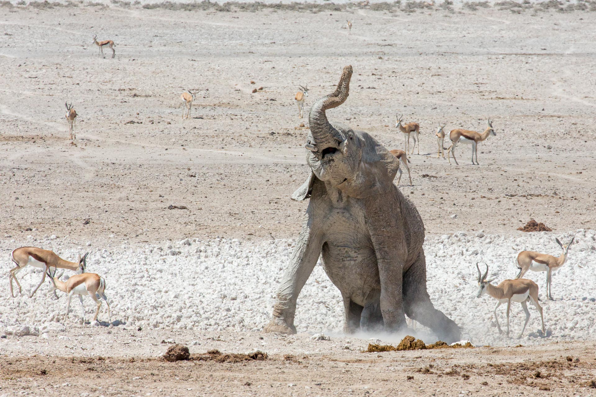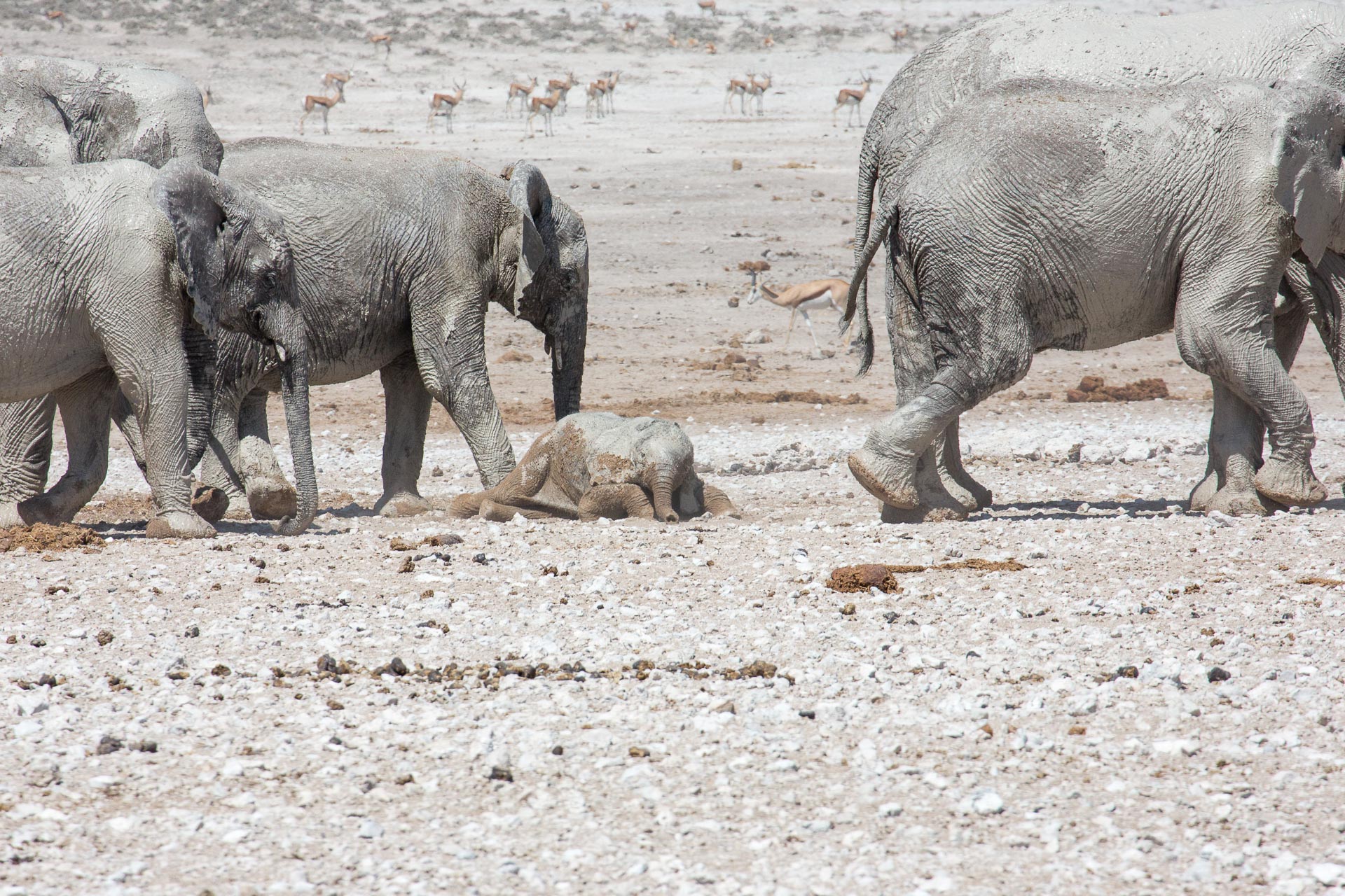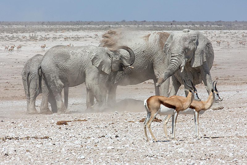 Wenn um die Mittagszeit eine ganze Elefantenherde am Wasserloch Abkühlung sucht, dann halten die anderen Tiere recht respektvollen Abstand.