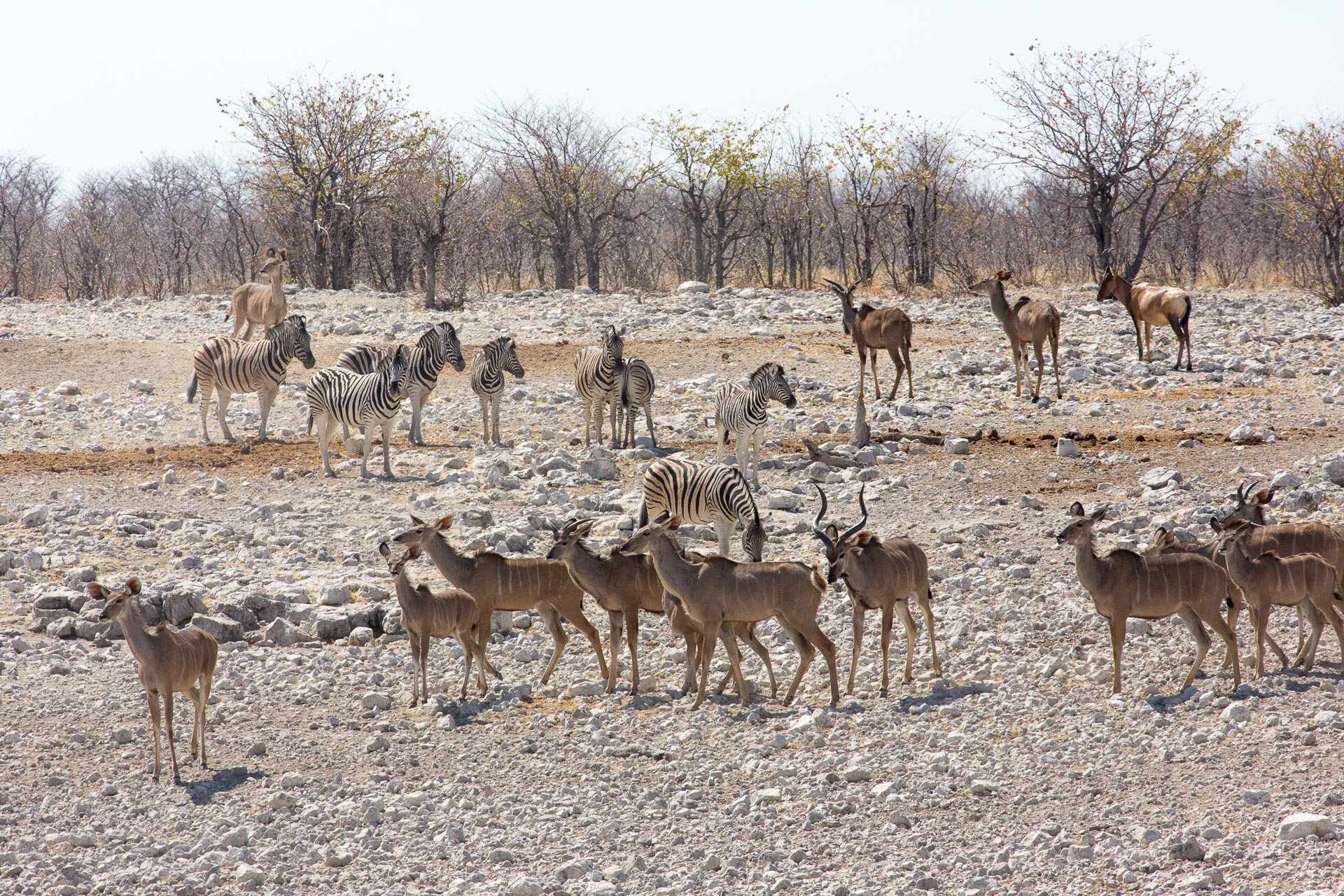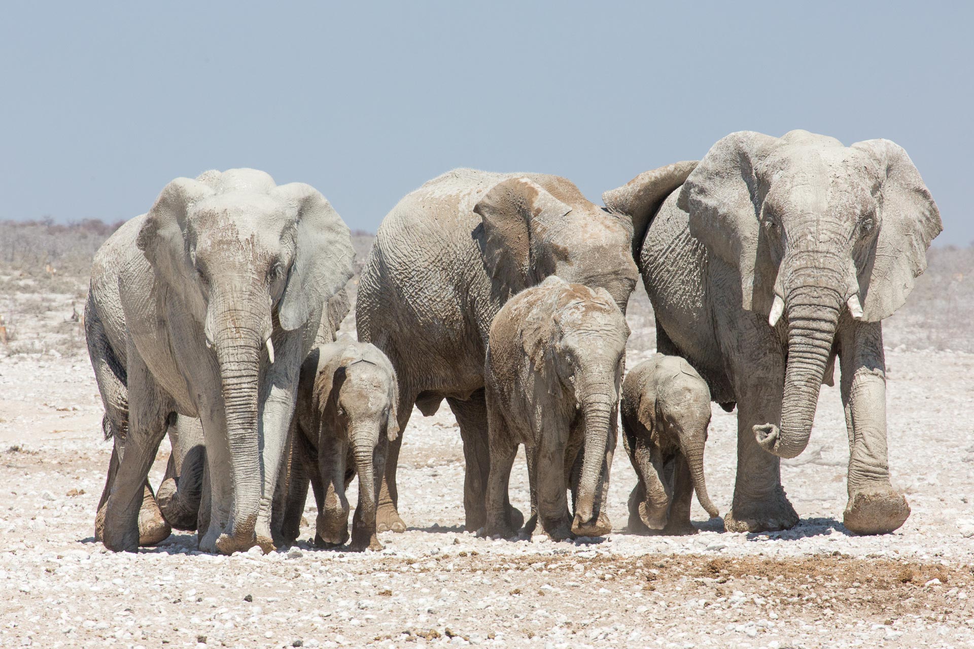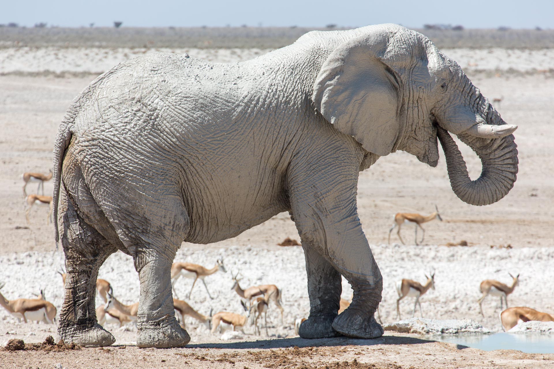 Wenn um die Mittagszeit eine ganze Elefantenherde am Wasserloch Abkühlung sucht, dann halten die anderen Tiere recht respektvollen Abstand.