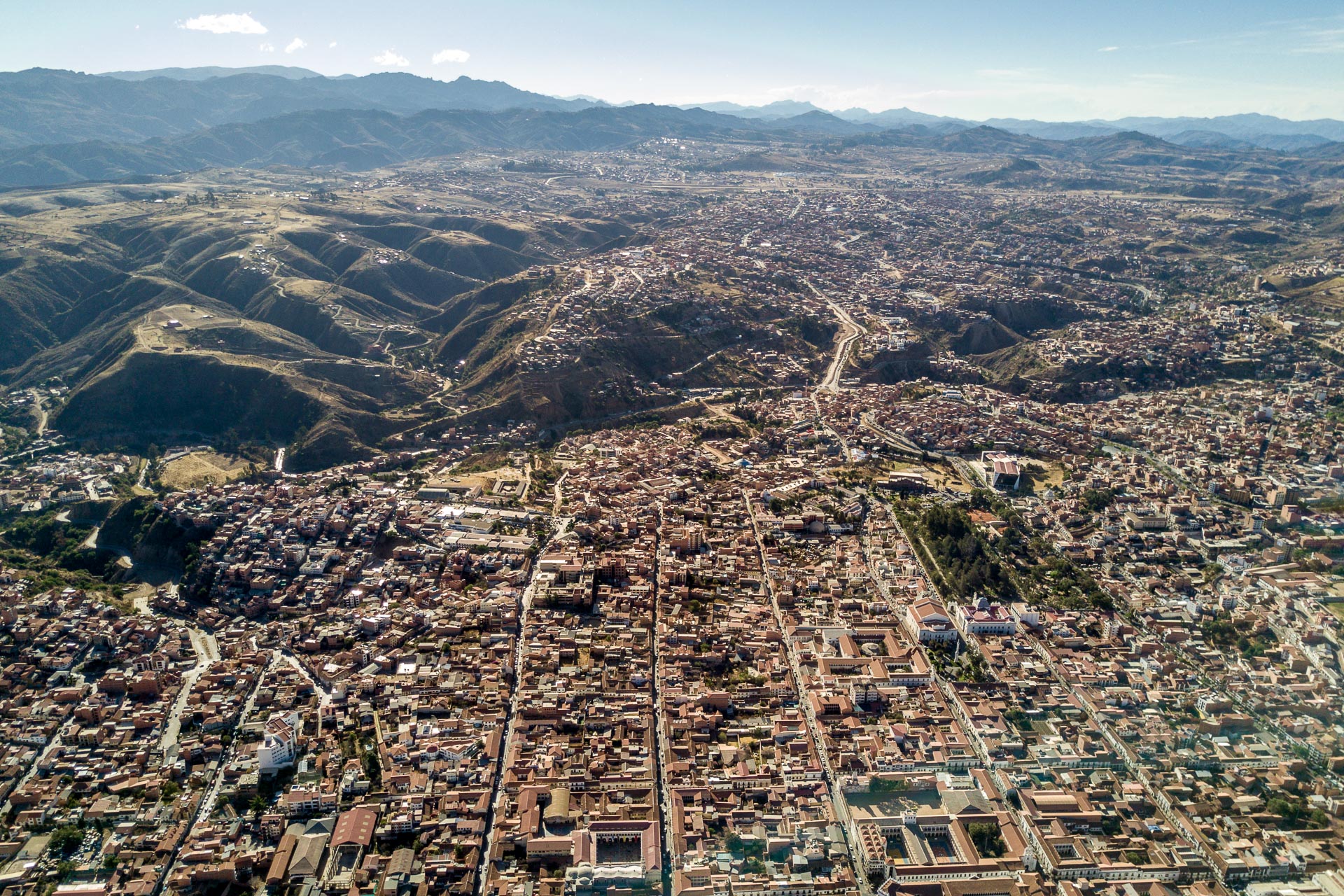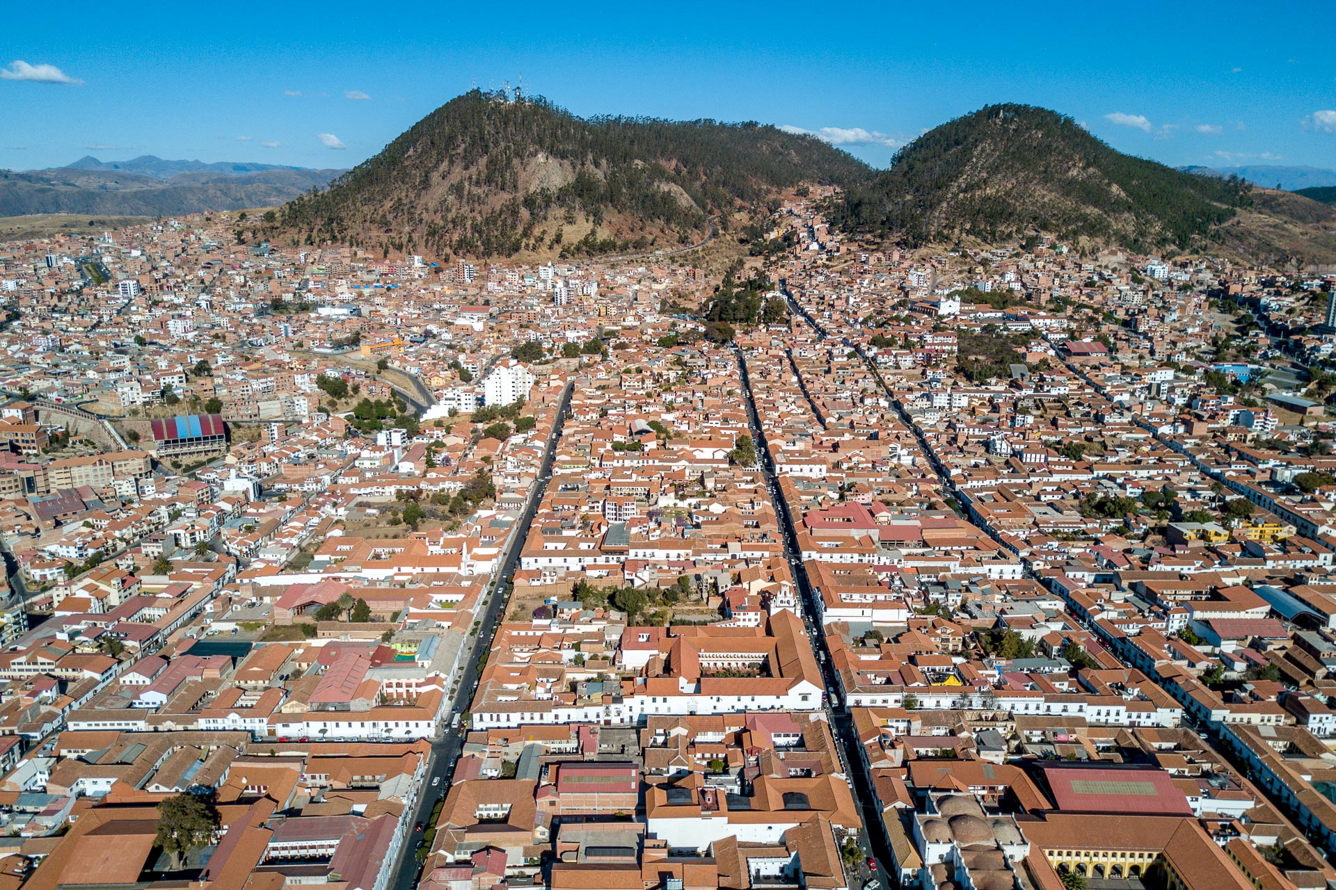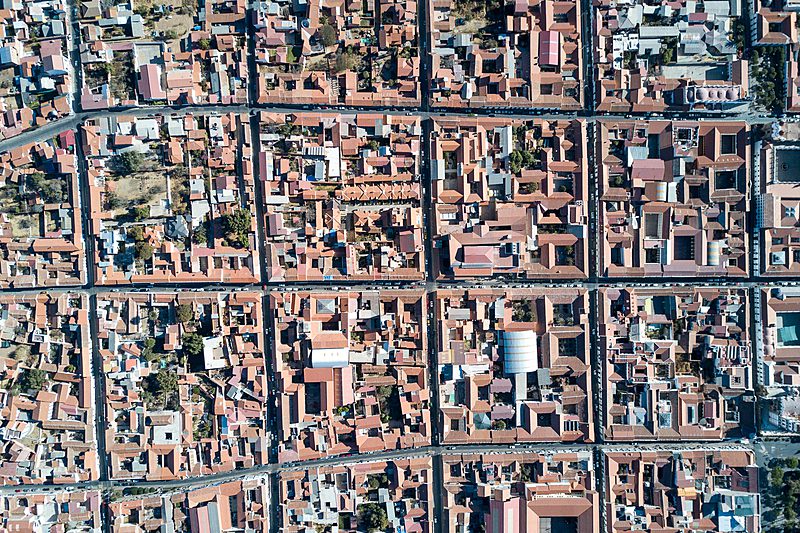 Aus der Luft kann man das typische Schabrettmuster der Kolonialstädte ganz gut erkennen.